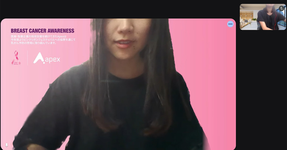 Apexは協賛企業として、毎月19日の「ピンクの日」にSNSでブレスト・アウェアネスを呼びかけ、10月の啓発月間に向けては社内クイズを実施するなど、社員や家族も日常的に啓発に関わっています。